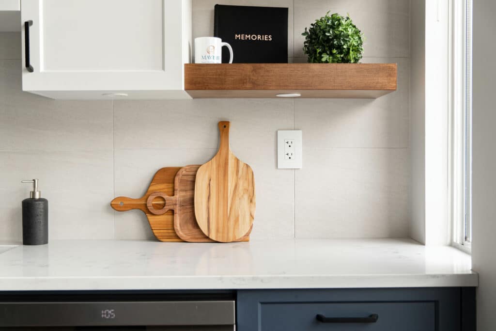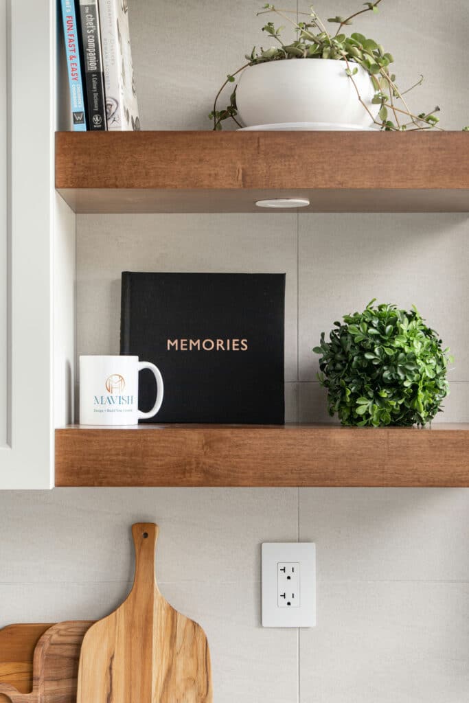 - Custom stained floating shelves